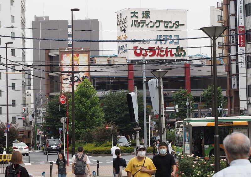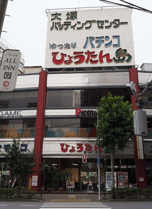 1階がパチンコ屋、2階がバッティングセンターです。私が大塚に通うようになった1970(昭和45)年にはすでにこの形で営業していたから、大塚のシンボル的存在といってもよいでしょう。開業は1965年だそうで、ひょうたん島という名前は前年からNHKで放送が始まった人形劇の「ひょっこりひょうたん島」に由来していると思われます。