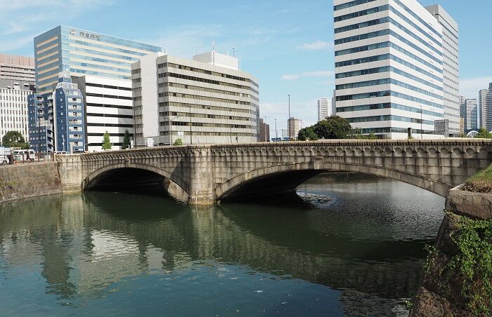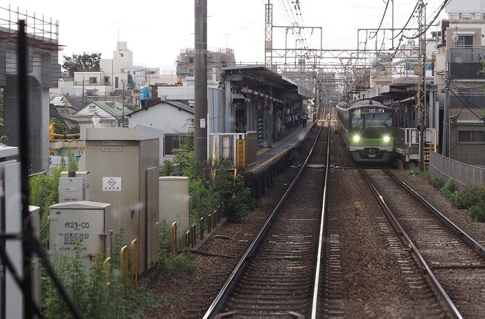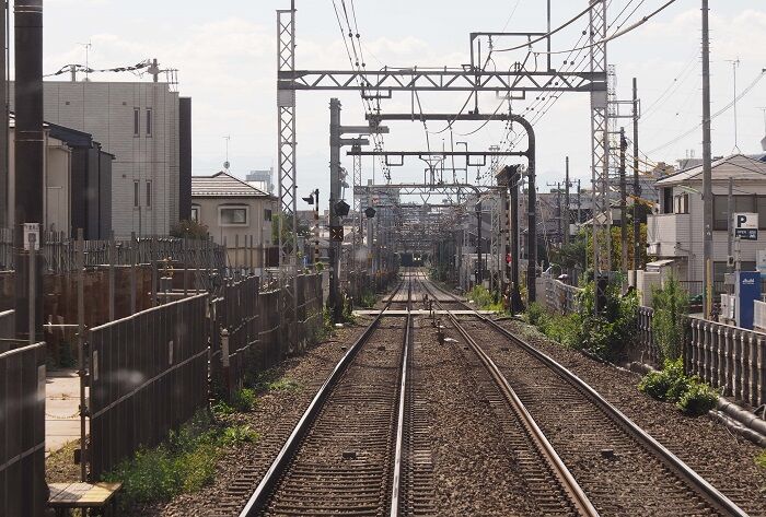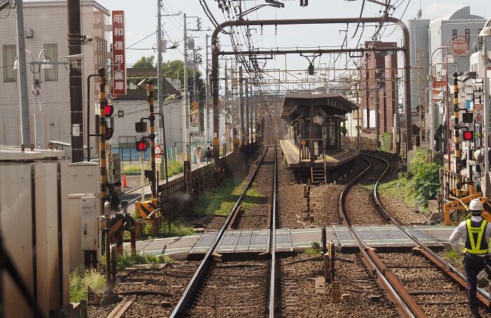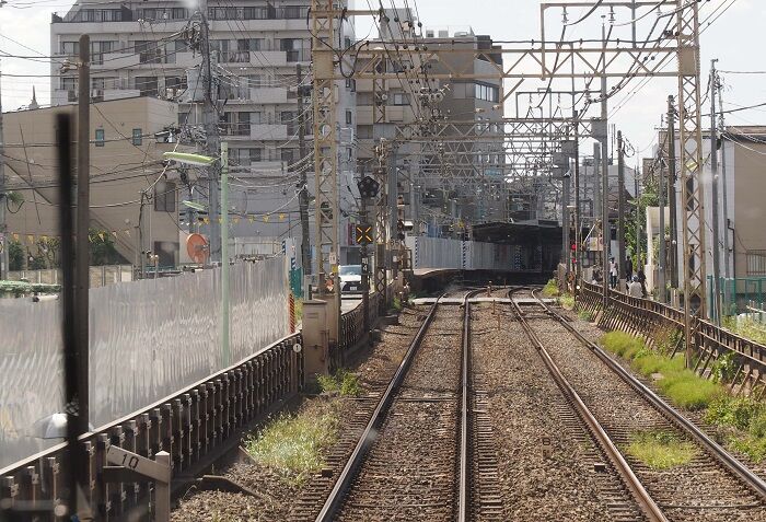 笹塚を出ると地平の代田橋に向かって下り勾配になるが、この途中の環7を越える手前あたりが高架化の始点になる。前方のホームは代田橋。