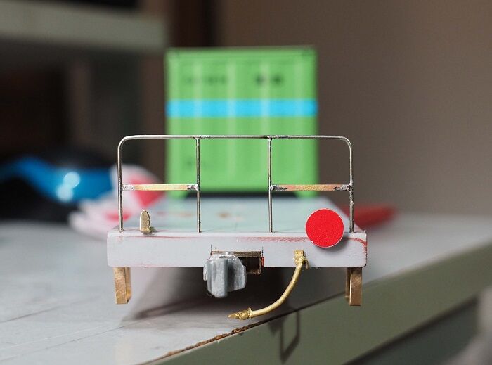 EF65に牽かせるコキ(もどき)の貨車、機関車の時代設定は昭和50年代なのに貨車はJRになってからのコンテナが主体となるが、そこは見た目優先であまり追求しないことにする。コンテナに合わせればコキフは必要なく、最後尾の車両には後部標識の赤い円板をつけるだけでよい。さてその円板、どうやって作ろうか。