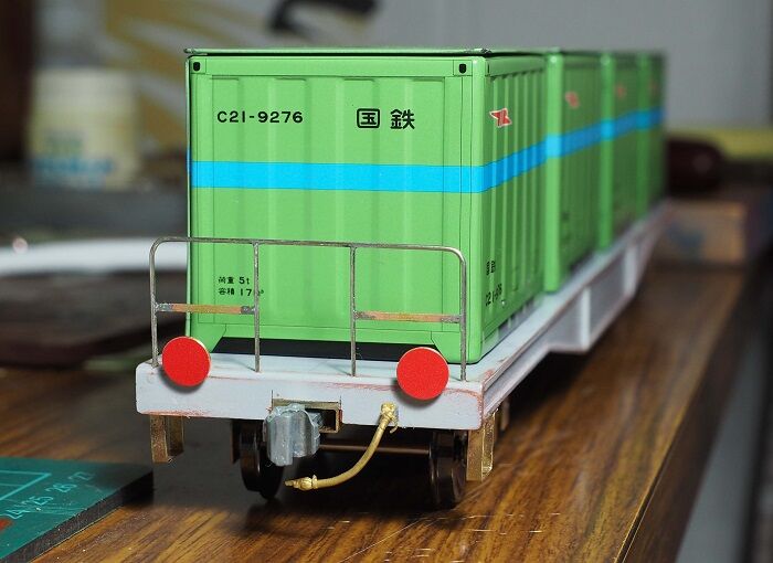 車体に仮止めしてみた。まぁいいんじゃないかな。編成の両端になる2両だけ、エアホースも付けた。100系のコキは3本ついているが、コキ(もどき)は最高速度85km/h(という想定)だから、ホースは1本でよい。