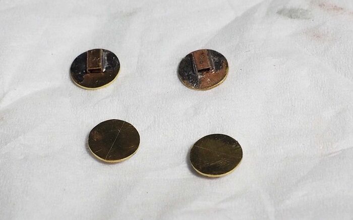 プラ板は削った粉が飛ぶし、静電気であちこちにつくからあまり使いたくない。本番は0.5mmの真鍮板にした。カプラポケット用に加工したけど中間のドローバー化で不要になった材料で、シールを貼ったら回りを切断機で8角形くらいに落とし、あとはヤスリで整形する。