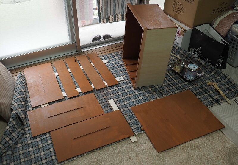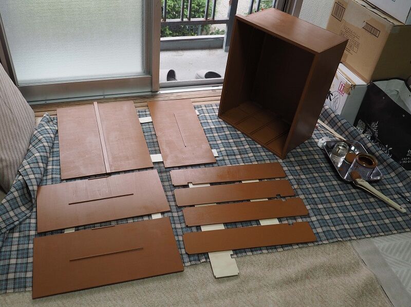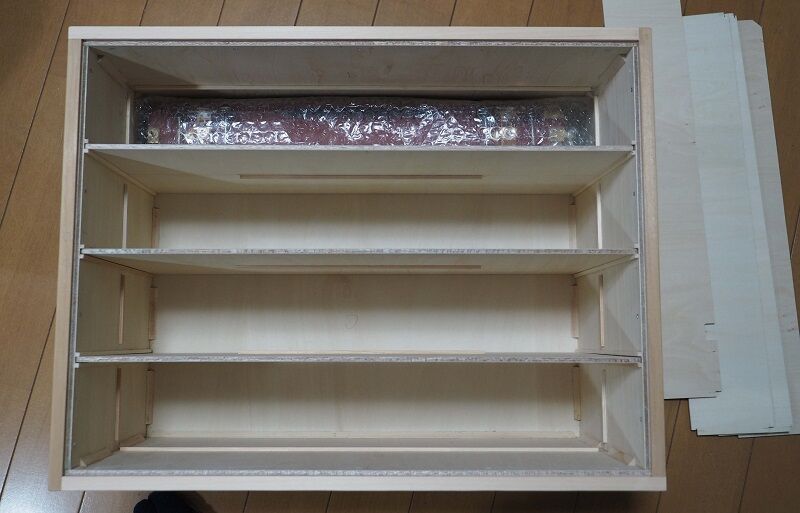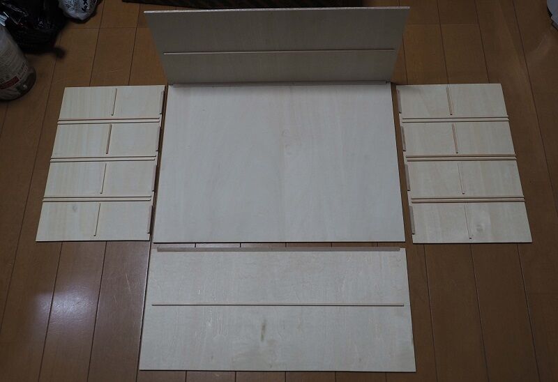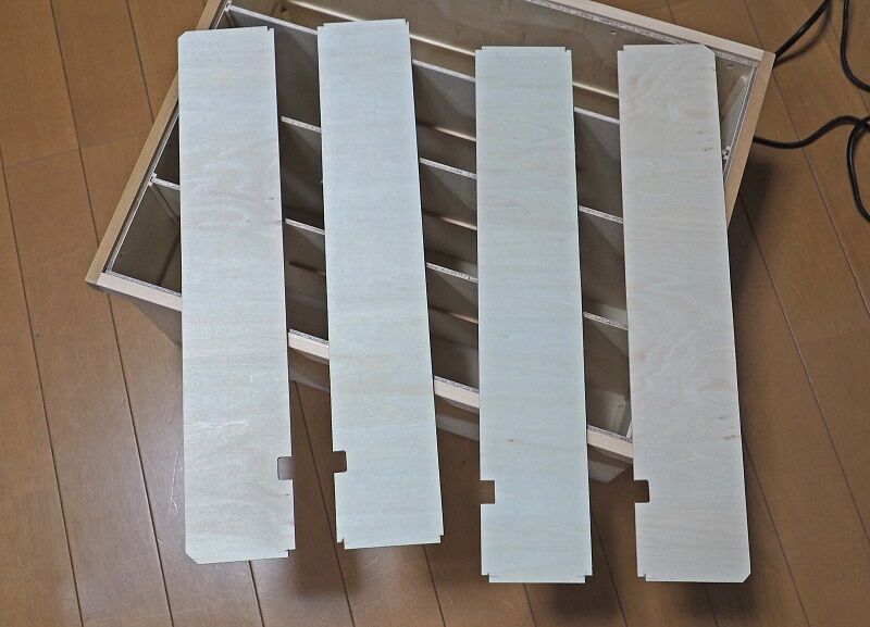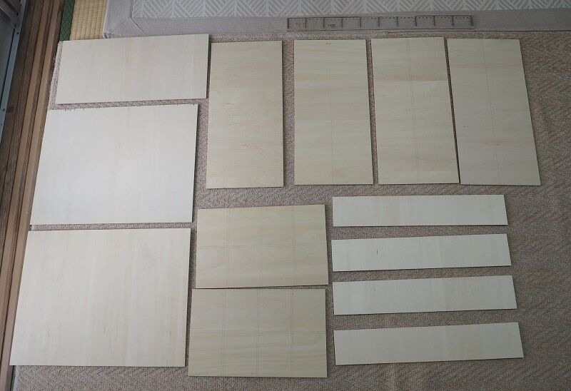 途中で板が足りなくなり、21日にもう一度450×600を1枚買い足し、所定の寸法に切り出した。右上の3枚とその下の細長い4枚は中仕切りになる。上に置いた定規は50cm。