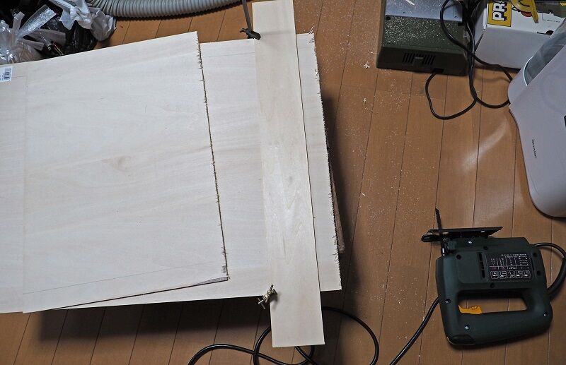 20日(土)に島忠で4mm厚、450×910のシナベニアを2枚買い込み、早速製作を開始する。直線を出すためジグソーを使ってみたのだが、歯が粗くて盛大にめくれが出てしまった。やむなく、最小限の部分は胴付き鋸で切った。