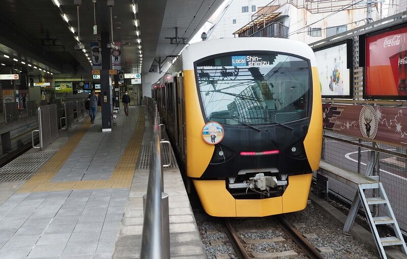 というわけで設営が終わった17日は東静岡から静岡を通り越し、その先の安倍川に向かった。ここは線路がほぼ南北に走っているので、下り列車の側面に陽が当たる。17:53の浜松行きは後ろ3両が元セントラルライナーの8000番代。