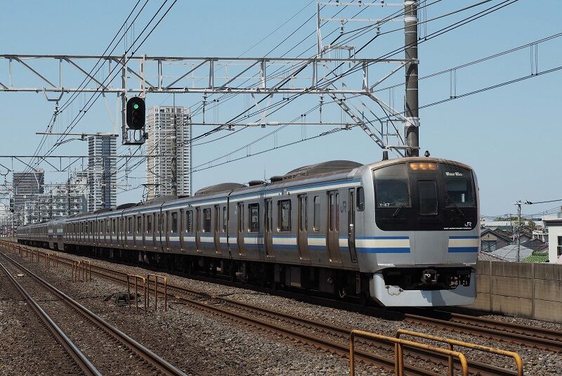 2021年4月15日、下総中山。制御装置は更新されたが、車体はだいぶくたびれてきた感じがする。現在の両数はE235系が半数を少し超えたところ。