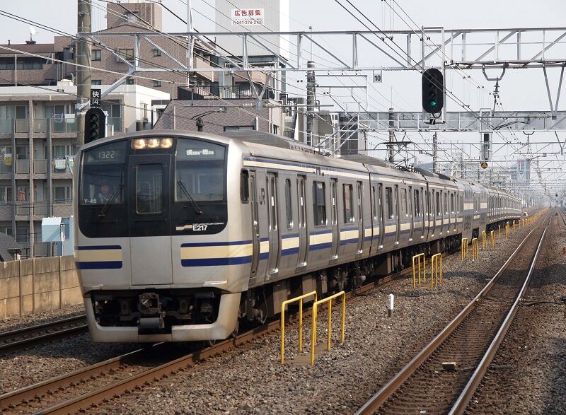 2004年9月30日、恵比寿。E217系は255系の1年後に登場し、113系を置き換えた。湘南新宿ラインがまだ新宿以南の運転だった頃は、E217系も新宿まで姿を見せていた。