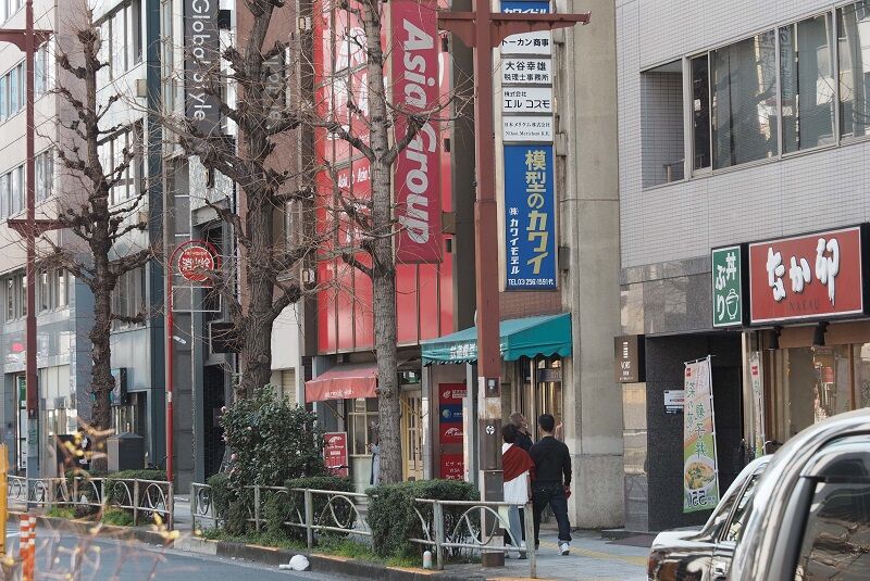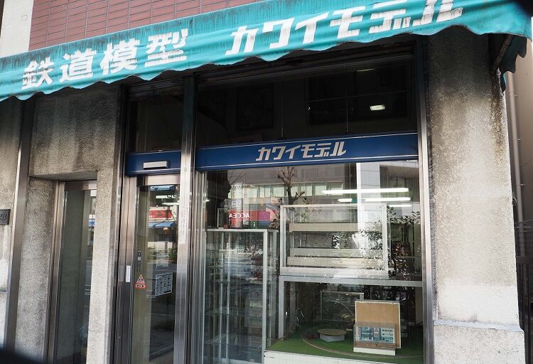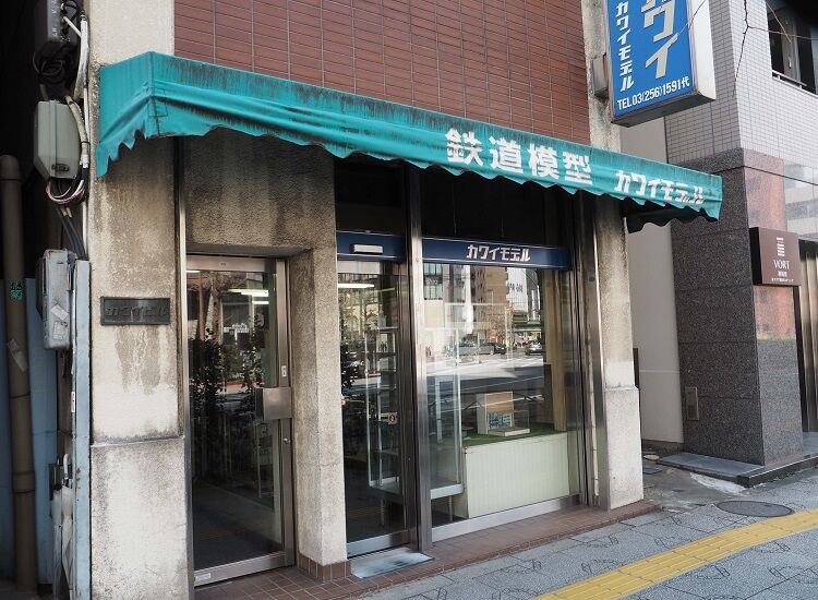 交差点から神田駅方向を見れば、いやがおうでも視界に入ってくるのがカワイモデルの看板。頭に「模型の」とついているから、怪しげなオネェサンの斡旋所と間違える人はいないだろう。真面目な話に戻せば、戦前から営業している鉄道模型店の草分け的存在で、鉄道模型社、つぼみ堂とともに模型界の御三家とされていた時代もあった。