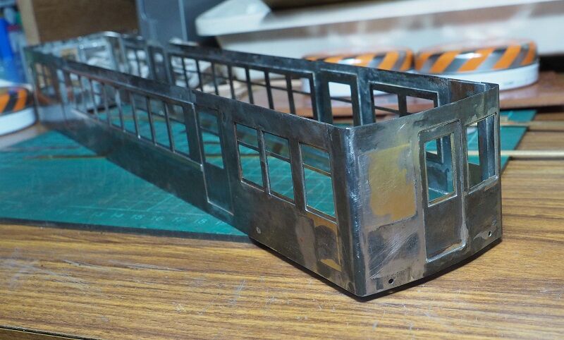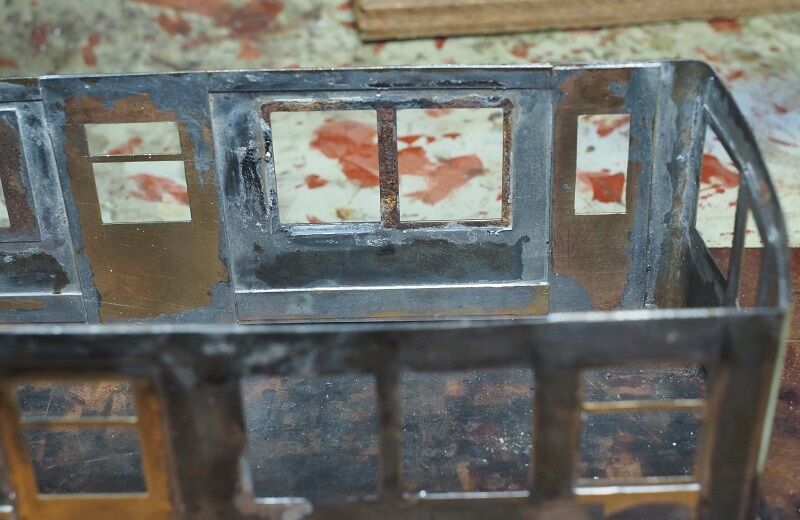 浮上がりがないようしっかり押さえつけてハンダを流した。それでも水洗、乾燥して数時間後にはうっすら錆が出てくる箇所がある。水洗は流水ではなく、どっぷり浸さないとフラックスが完全に除去できないようだ。ハンダ付けが終わっても屋根、床板の合わせなどがあるからすぐに塗装はできない。錆止めスプレーでも吹いておくか。