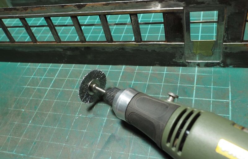 右側2窓分の下枠がワイヤーブラシをかけたところ。隅っこの磨き残しは細いドライバーなどでほじくるしかない。