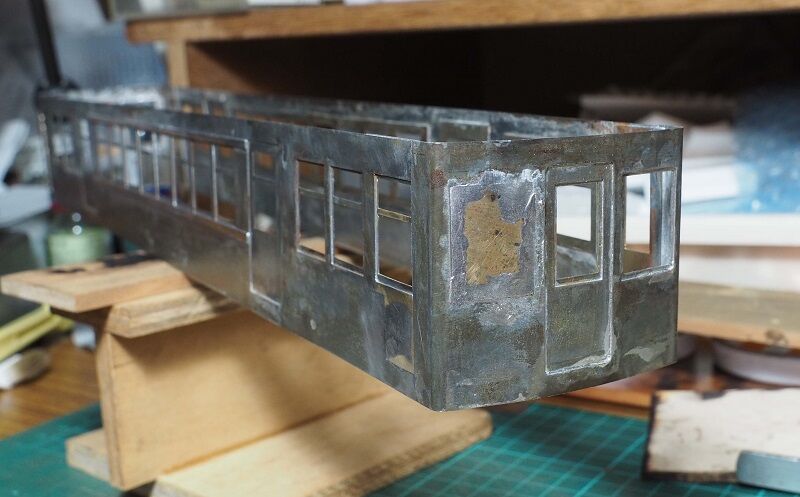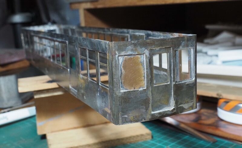 7月8日、非パンタ側でトイレとなる部分の前面窓に裏から当て板をハンダ付け。