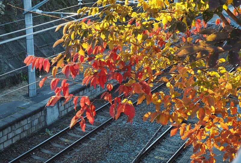 ホームにかかる木が紅葉していて、夕陽を受けてなかなかいい雰囲気になっている。ここに電車を絡めて撮ろうと待機していたのだが。