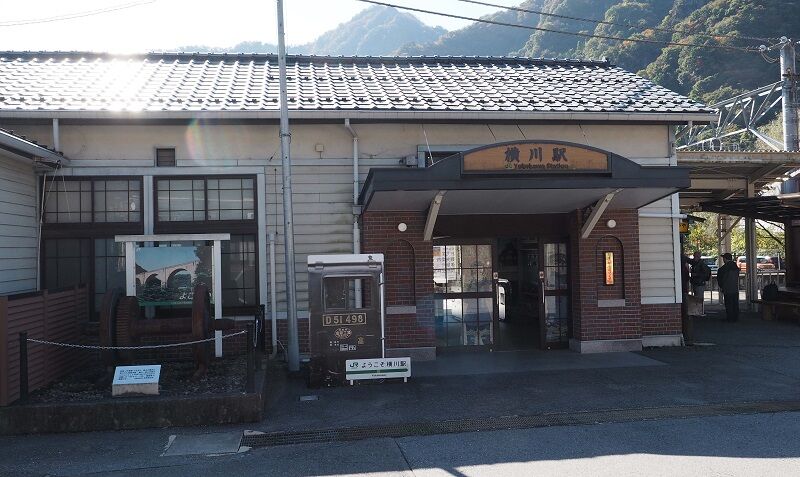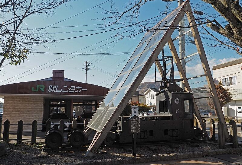 横川駅はこぢんまりとした造り。左にEF63の動輪が置かれている。