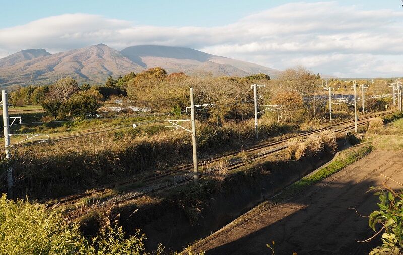 小諸寄りにくねくねした道を20分ほど歩く。駅に近い方は線路がやや低く、足回りが隠れてしまう。ここは跨線橋に続く道路からで、浅間山がバックに入るのだが、もう列車の側面には陽が回らないし、跨線橋の影も落ちている。ここでのベストタイムは昼頃からの数時間というところか。