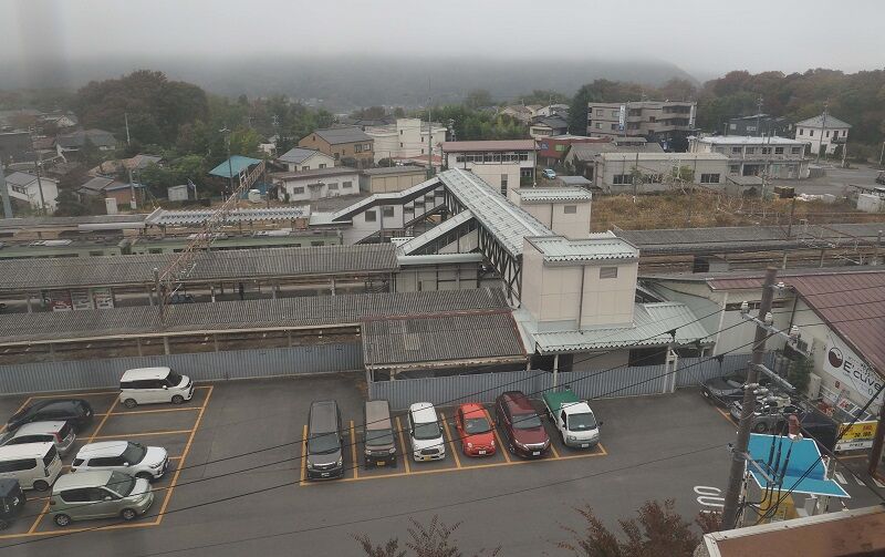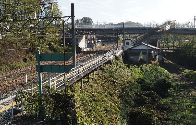 駅の全景。私は乙女湖公園に通じる階段から撮影している。奥の道路から降りた所に簡易改札がある。