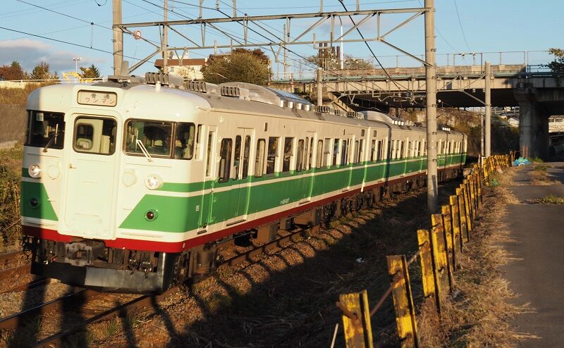 次は9:16頃の2631Mなので、暇潰しに上の道路に出て歩き回っていたら、115系の唸りが聞こえてきて上り列車が通過。えっ、こんなの時刻表に載っていないじゃないか。よく見ると乗客がいるから回送ではない。団臨なのだろうか。