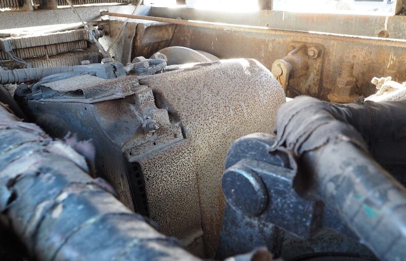 台車カバーの隙間からモーターが見える。ギアはケース付きだった。運転台と反対側の先端(写真左)に抵抗器が置かれている。