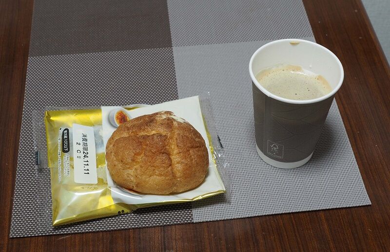 風呂上がりの夜食。近くにあるツルヤというかなり大きいスーパーで仕入れた。コーヒーはフロントにサーバーがあって無料。ツルヤは20:30閉店で朝は9:30開店だから朝食の調達には使えない。
