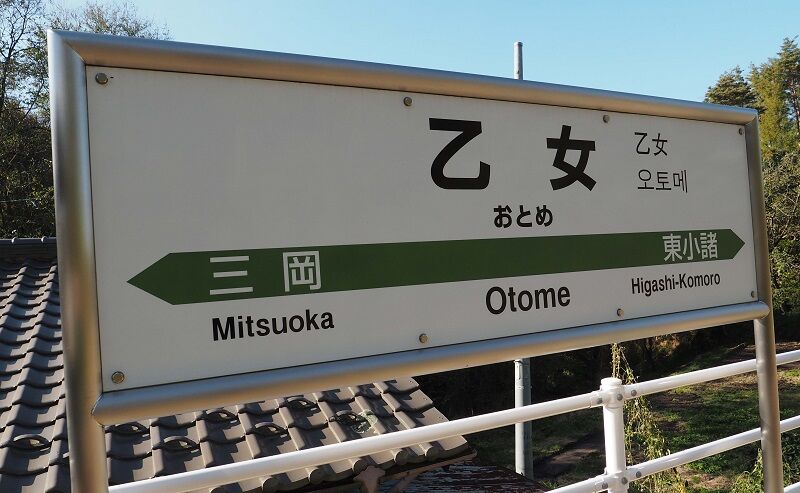 小海線で2駅目の乙女で下車。ホームの幅が狭いので、駅名票を真正面から撮ろうとすると線路に落ちてしまう。
