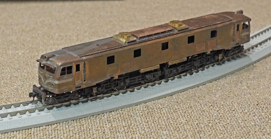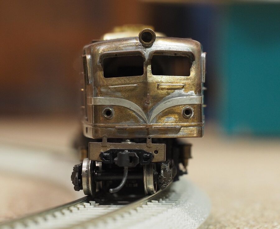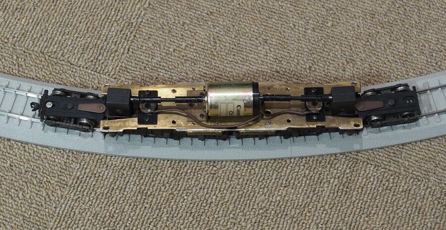 車体を仮乗せしてみる。4Vでゆっくりだがスムーズに走る。カーブに入る所で片側の先台車がはじかれた。復元バネを調整して一応収まったが、構造的に不安定なので改良の余地がある。まぁ、先輪付きのF型機で600R通過は止めておいた方が無難だ。