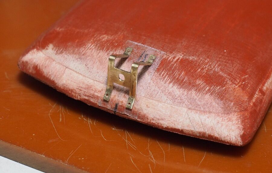 ステーの先端を屋根に合わせて曲げ、0.6mmの穴を開ける。両面テープで仮止めして角度を確認する。