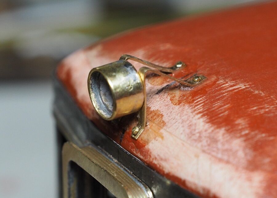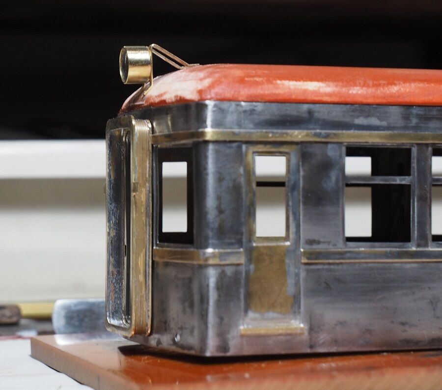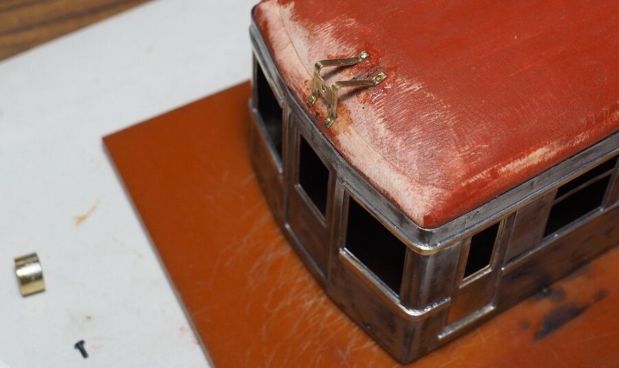 パーツとしては取付けステーまでできあがっている。さて、これをどうやって屋根に固定すればいいのか。金属ならハンダ付けでOKだが、木製だから接着剤だけでは強度的に不安だ。ライト本体をネジ止めしているのは位置決めに便利だろうと考えたからで、これが取付けでも役に立った。