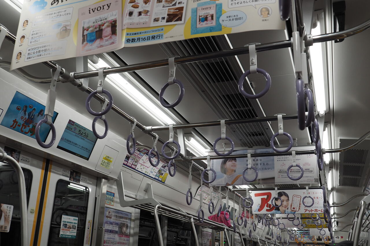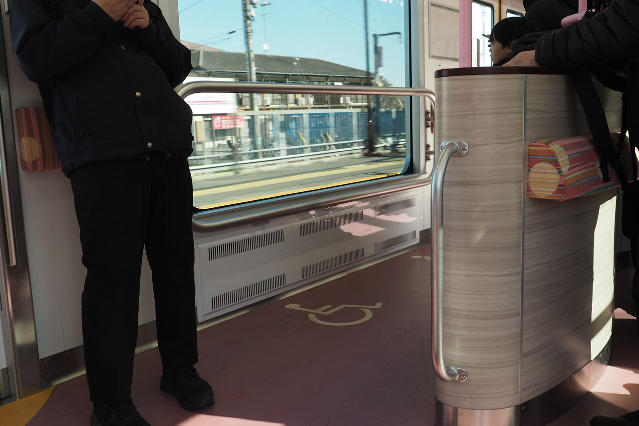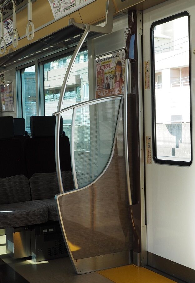 吊り手は丸形、色は写真ではわかりにくいがライトパープル。荷棚は横方向のパイプ。袖仕切りは立ち客との干渉防止にはやや中途半端だ。