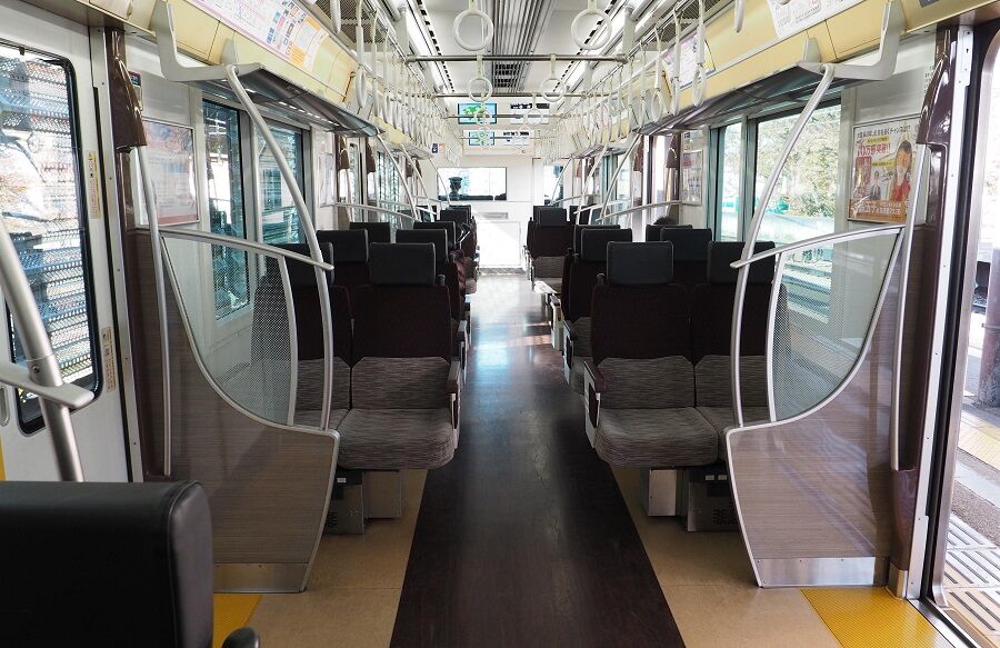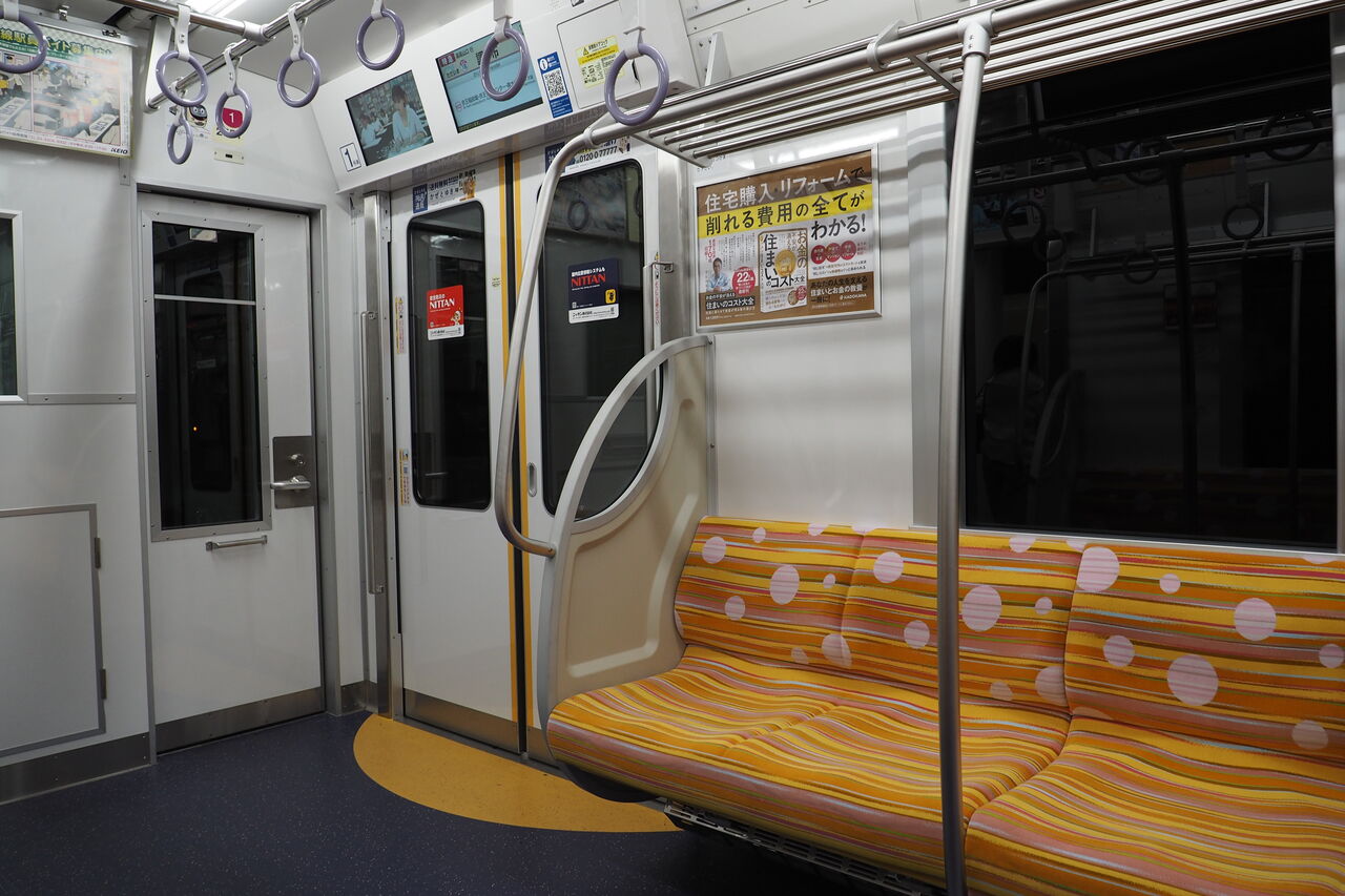 ドア部分の枕木方向の吊り手は3列になっている。冷風吹出し口、照明などもいたってオーソドックスで、メトロ車のようにブッ飛んだデザインは見られない。