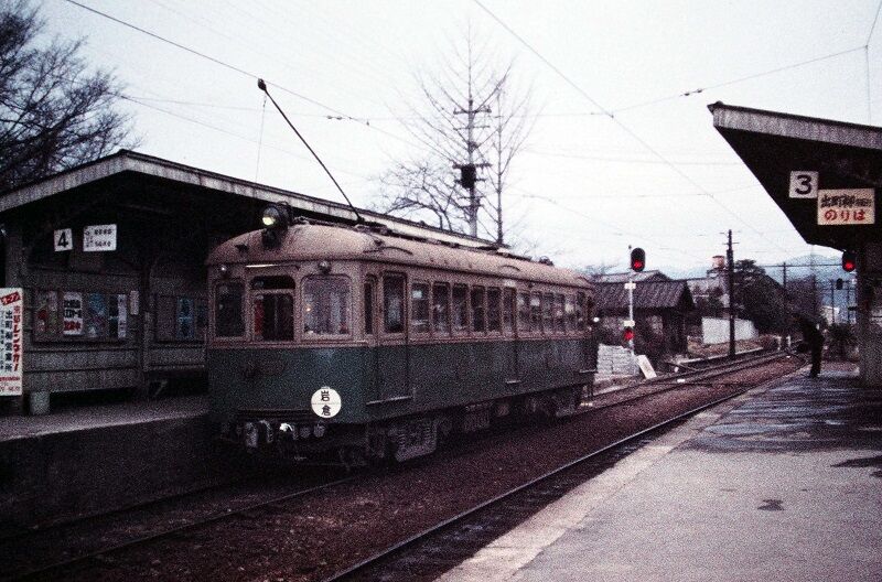京福の宝ヶ池。よく見ると運転士が窓から顔を出し、ホームの駅員と挨拶を交わしている。