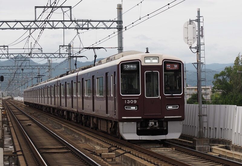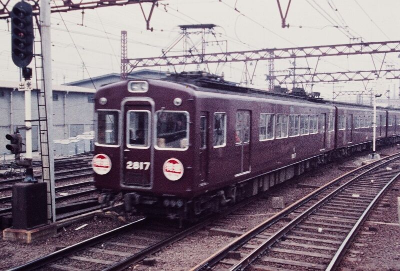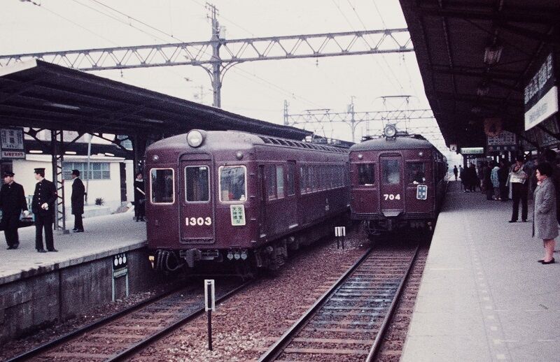 大阪までは阪急に乗ったようだ。淡路で左の1300系は天神橋~北千里、右の700系は京都~十三になっている。梅田の京都線は2線だったから普通の一部は十三止まりだった。阪急の職員も制服は詰め襟のように見える。
