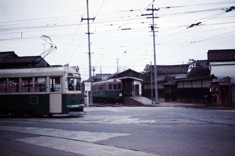 市電と京福叡山線が交差する元田中。市電は900形、叡電はデオ200形。手前の斜めの線路はかつて市電が叡電に乗り入れていた頃の名残を留めている。この頃は使われていないから架線はない。