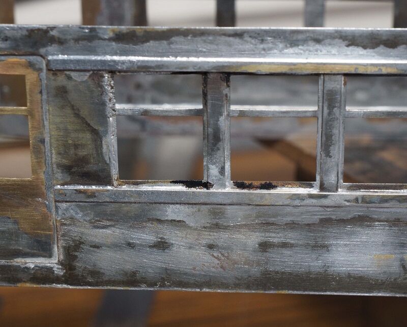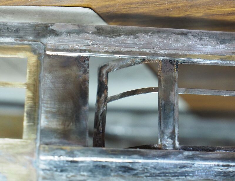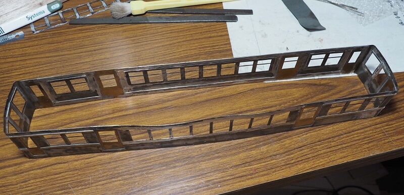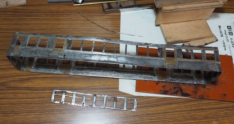 パーツ箱からソフトメタルでかなり甘い造りの幌枠を発掘した。買った覚えはなく、貰い物だと思う。左が原型だが近鉄のはテッペンが山型ではないので、写真を見ながらそれらしく整形したのが右。