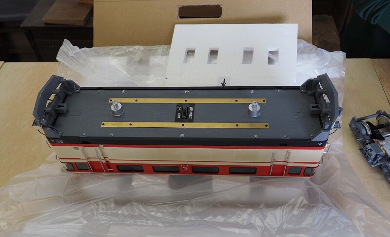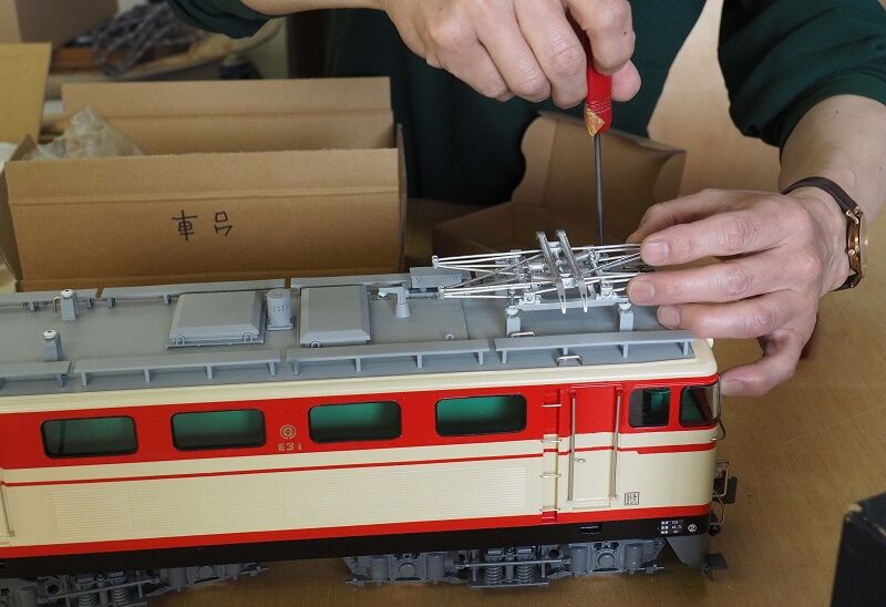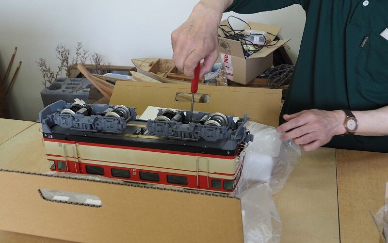 今回の目玉は昨年の模型ショーで発売されたGゲージの西武鉄道E31形の完成お披露目。嵩張るので別便で送られていたのを開封し、組立ての儀が執り行われる。