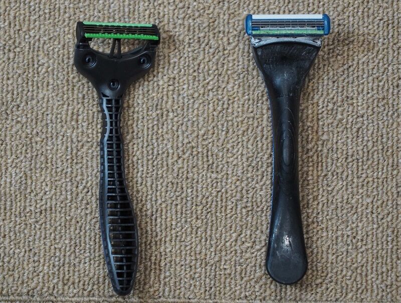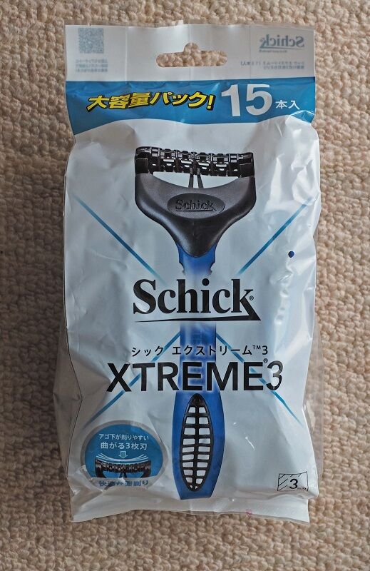 替え刃を使う限りどのメーカーでも値段に大差はない。だったら替え刃ではない使い捨てタイプはどうなのか。左は3枚刃の使い捨てタイプで、健康ランドやサウナに置いてあるようなのよりは造りもしっかりしている。試しに使ってみたところ、剃り心地は替え刃のとほとんど変わらないし、耐久力も20日以上はある。これで1個200円もしないからコストはほぼ1/2ということになる。