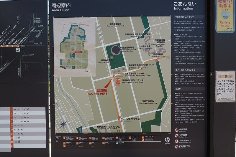 清原地区市民センター前はトランジットセンターとして路線バス乗り場、駐車場が併設されている。バス乗り場は3箇所あるが、発着するバスはいずれも1時間に1本程度。来る時には旧国鉄塗色のバスを見かけたが、この時間には現れなかった。