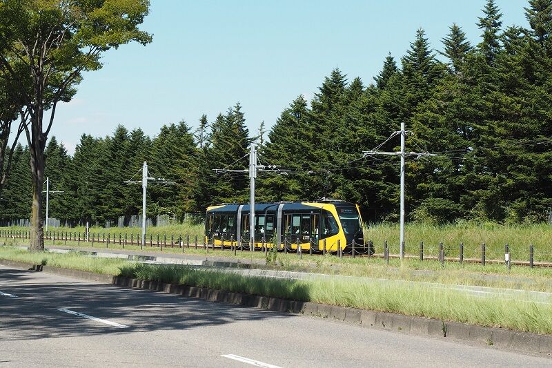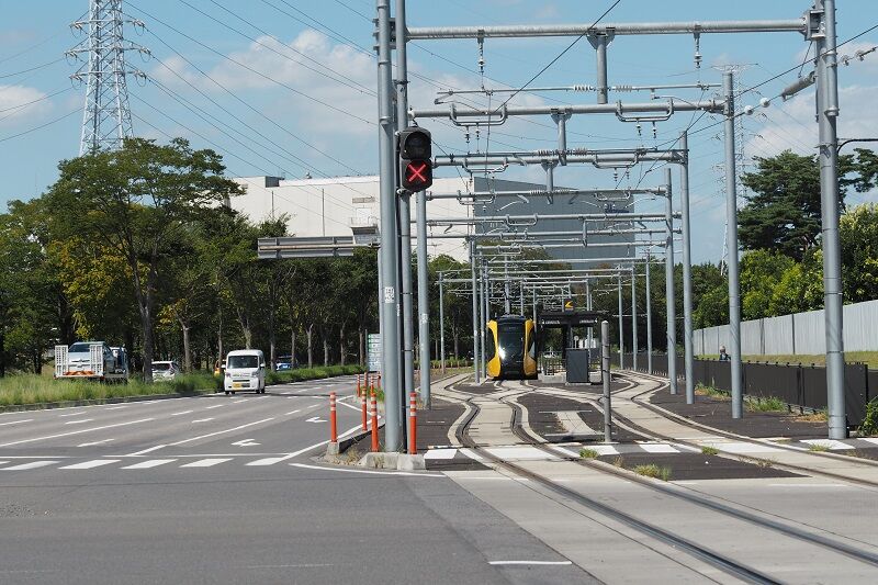 芳賀町工業団地管理センター前からゆいの杜西までは鬼怒通りを走る。これはゆいの杜東で沿道には食い物屋も多い。写真でわかるようにほとんどの電停は交差点を渡った先にある。普通の路面電車なら交差点の手前なのに何故? 答えは車の右折レーンを確保するためなのだと思われる。