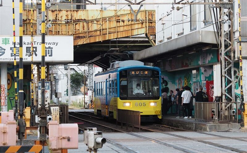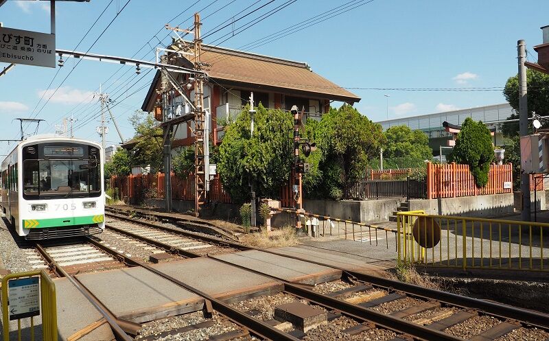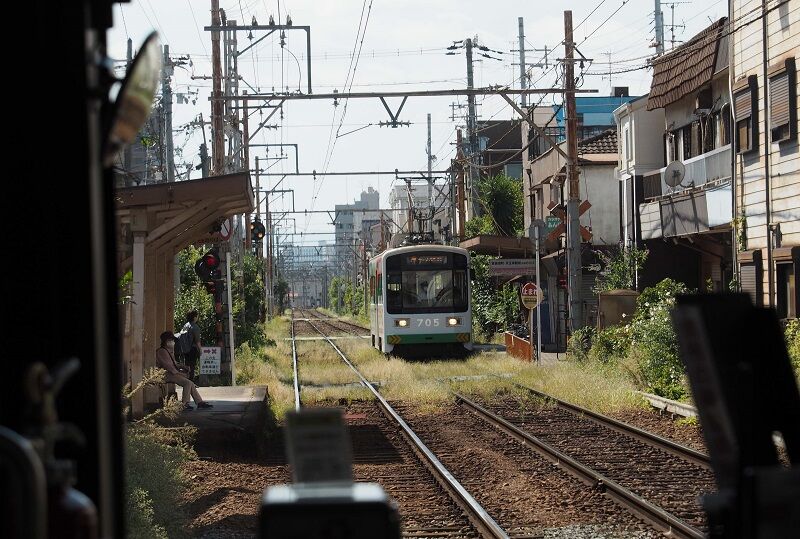 住吉で恵美須町からの線路(中央奥)と合流する。斜めに横切り住吉公園に達する線路は2016年に廃止された。