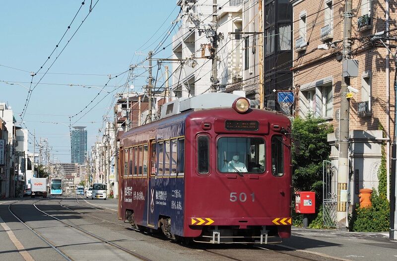 一駅乗り、帝塚山4丁目から歩く。これはモ501形でスポンサーは桃山学院大学。