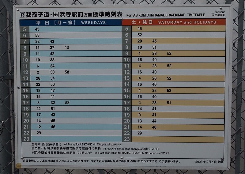 あびこ道。車庫があり、日中はほぼ半数がここで折り返す。大阪市はここまでで、この先の大和川を渡れば堺市に入る。