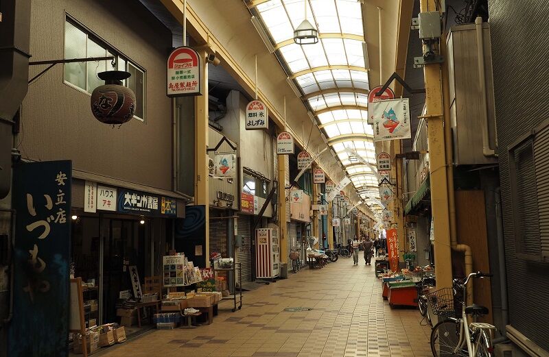 線路の西側、安立町の商店街はそこそこ賑わっている。
