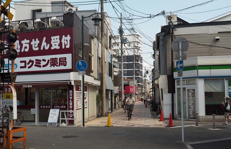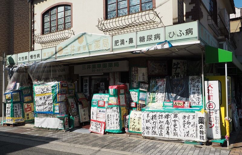 電車通りに面した薬屋。いつ見ても手書きの札で埋め尽くされている。