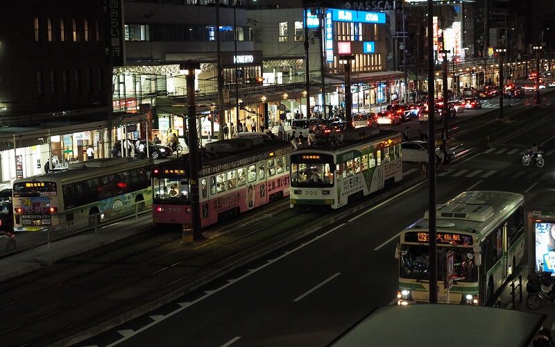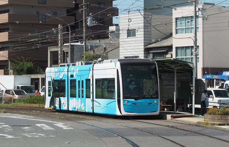 綾ノ町から併用軌道になる。電停は綾ノ町だが、町名は綾之町。車両は講談社のラッピングの1101。