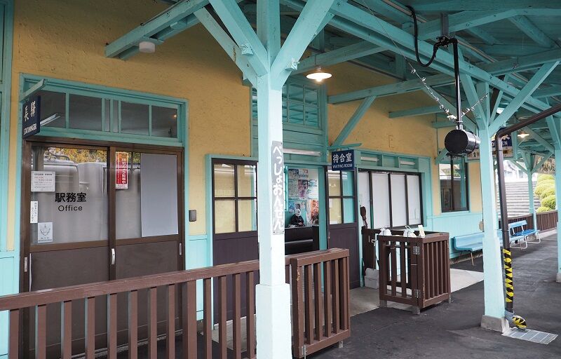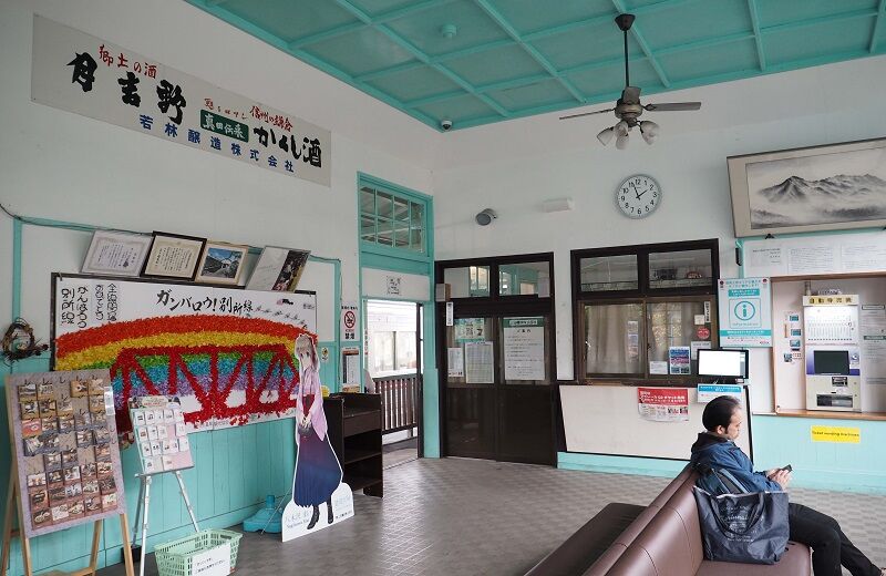 駅舎内も昭和の雰囲気。鉄道娘の「八木沢まい」は、次駅とその次の八木沢と舞田に由来する。
