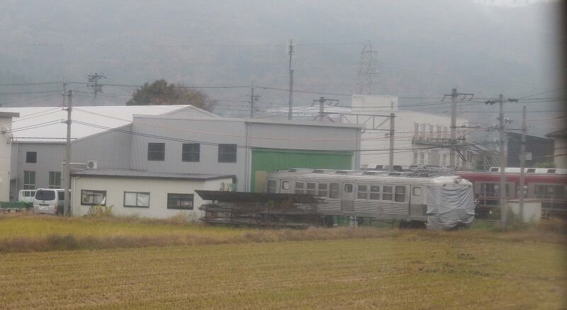 下之郷の車庫にステンレスカエルのデハ5200が見える。なんとか近くまで行けないだろうか。