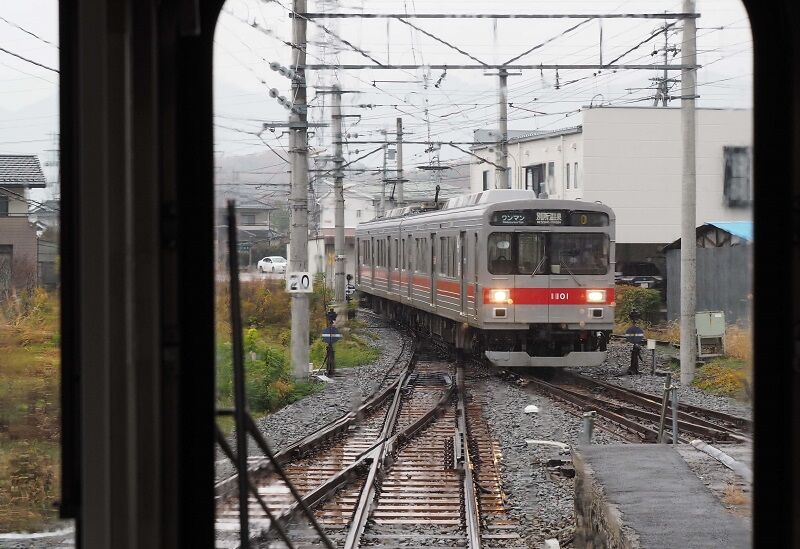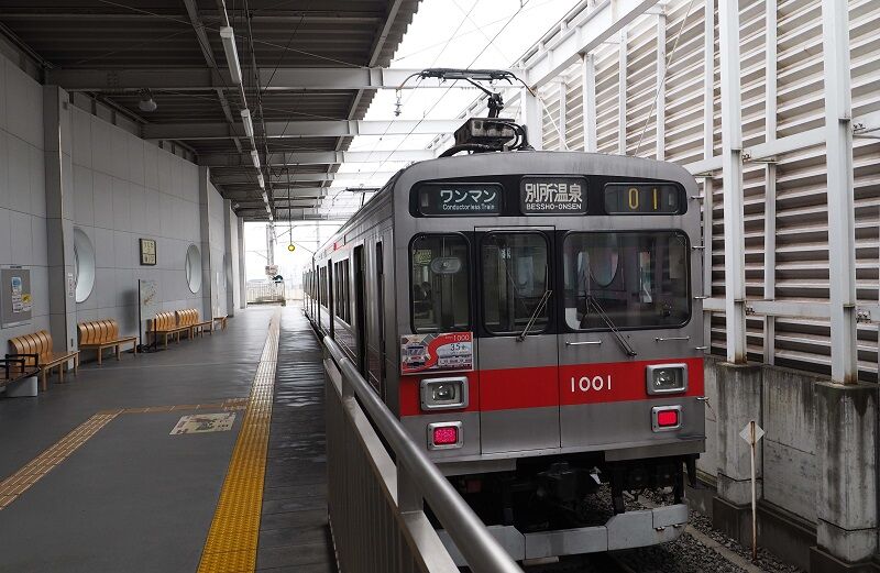 次の発車は13:16、ほぼ待ち時間なしだが、おかげで昼食はお預けになる。日中の列車はほぼ1時間に1本。車両はすべて元東急1000系で、デハ1001-クハ1101は赤帯の東急カラーになっている。
