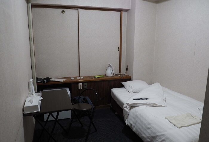 部屋は413号室。ウォシュレットなしの断り付きで4500円は値段相応だろう。奥が道路に面した窓で、カーテンより遮音と断熱の効果は高そう。ネットの口コミではシャワーの温度調節ができないとあったが、1本のハンドルを左右に回して調節するタイプなので、確かに適温にするには微妙な手加減が必要だった。数日前から風邪気味だったので、薬を飲み21時にはベッドに潜り込んだ。