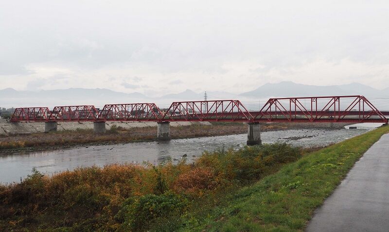 3分も歩けば千曲川の河原に出て、上田電鉄の鉄橋が見える。流れは画面の左から右なので、ここは右岸。2019年10月の台風で一部が流出し、2021年3月に復旧した。