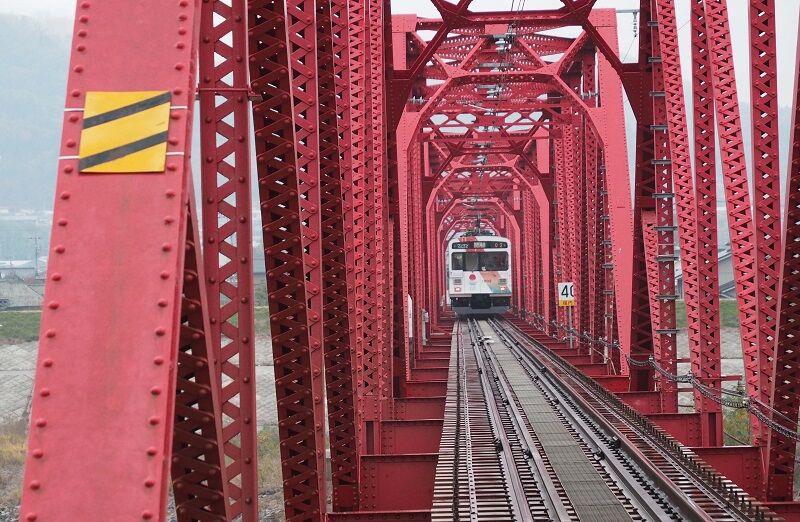 数分後、城下で交換した上りが来る。トラス橋だからどこでシャッターを切っても前面に邪魔が入る。