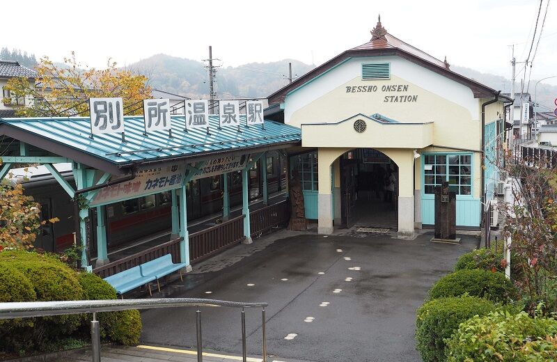 駅舎はそのままストラクチャーキットになりそうな雰囲気。中塩田も同じ様式の駅舎が残っている。別所温泉の看板は屋根の垂木に対して少し温泉街方向に傾けてある。