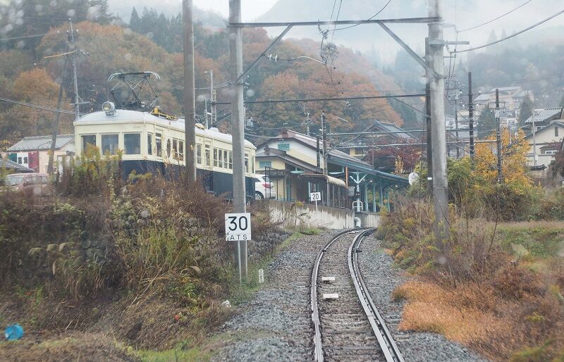 折返しは14:01の発車。後尾の運転室越しに別所温泉の構内を撮っておく。駅直前まで急勾配なのがわかる。