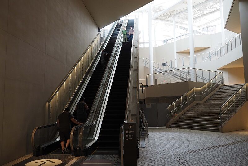 ペデストリアンデッキのある2階まで一気に上がるエスカレーター。途中で立ちくらみを起こしたら洒落にならないから、しっかり手摺りを掴んでおく。